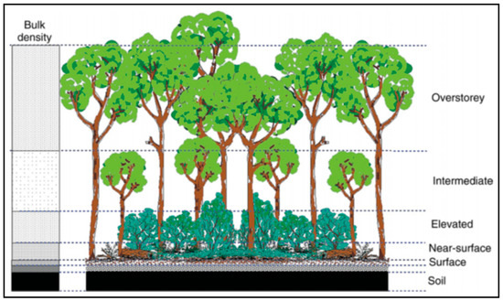 Distinct fuel layers within a dry eucalypt forest, with the grayscale on the left representing the relative bulk density of each layer [29]. Figure reproduced with permission.