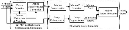 The algorithm workflow of moving target detection stage: (a) The moving background compensation calculation step. (b) The moving target extraction step.