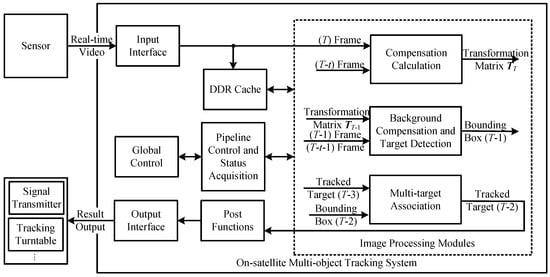 The multi-object vehicle tracking algorithm for moving backgrounds proposed in this paper was implemented on a satellite, where real-time MOT processing is entirely implemented by an FPGA. The structure of the proposed on-satellite system is shown in Figure 4, and it mainly includes input and output interfaces, a global control module, a pipeline control and status acquisition module, a DDR cache, and image processing modules. The input interface receives the real-time data from the sensor and converts the pixel-by-pixel readout from the sensor into an image data stream that is sent to the image processing module for processing. This data stream is also stored in the DDR cache. The output interface outputs the target tracking results, which can be used by the satellite to control the turntable and transmit result; thereby, autonomous control of the remote sensing satellite is achieved. The global control module controls all system functions and obtains the system status for telemetry and remote control, while the pipeline control and status acquisition module controls the pipeline status of the image processing module and obtains the working status of each module. The DDR cache buffers the results of the image processing module and also buffers multiple image frames. The image processing modules are the compensation calculation module, the background compensation and target detection module, and the multi-target association module. These three modules are processed in a pipeline, and read-and-write interactions are performed with the data in the DDR cache to achieve real-time image processing.