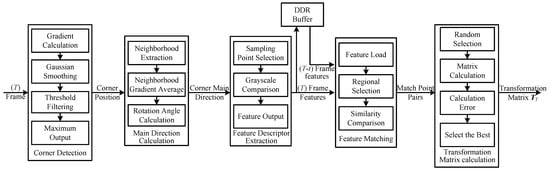 In the compensation calculation module, the transformation matrix between T frame and frame is calculated by acquiring and matching the corner features of an image, i.e., the compensation information of the moving background. The structure of the compensation calculation module is shown in Figure 6, and it includes five submodules: corner detection, main direction calculation, feature description extraction, feature matching, and transformation matrix modules. The corner detection submodule extracts the corner points of the current frame image, while the main direction calculation submodule calculates the main direction of the corner points. The feature description extraction submodule extracts rotation-invariant corner features according to the main direction and stores the corner features in the DDR cache at the same time. The feature matching submodule matches the corner features of frame T with those of remtheframe , while the transformation matrix calculation submodule calculates the affine transformation matrix of the image according to the matched feature points and obtains the translation amounts and .