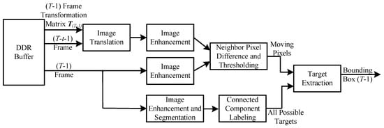 The background compensation and target detection modules begin calculating in parallel with the compensation calculation module. Background compensation requires the image translation parameters in the affine transformation matrix output by the compensation calculation module, and the background compensation and target detection modules process frames and frames. frames are written to the DDR cache simultaneously while the compensation calculation module is operating. The DDR has a cache of the original image of frame . The background compensation and target detection modules obtain the original images of frames and and the affine transformation matrix of frame from the DDR cache. The structure of the background compensation and target detection module is shown in Figure 7, and it includes six submodules: image translation, image enhancement, neighborhood pixel difference and thresholding, image enhancement and segmentation, connected domain marking, and target extraction modules.
