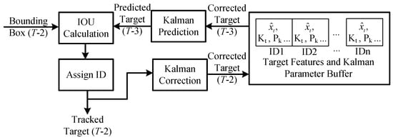 where indicates that the tracked target m is assigned to the predicted target n. For successfully matched targets, the state is updated by feeding it into the Kalman filter. For unassigned tracked targets, a new Kalman filter is created. Predicted targets that have not been matched for a long time are deleted.