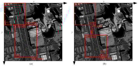 Background motion compensation simplifies the affine transformation of the image, retaining only the translation parameters and . Directly subtracting two frames will result in a large number of motion pixels due to other small changes between the frames. We note that the brightness of the target vehicle in remote sensing videos is generally higher than that of the surrounding road, and the target vehicle is small in size. After subtracting the pixel where the vehicle target is located in the current frame from the region of the corresponding pixel in the previous frame, the difference is large. For the stationary background area, since there is no movement between the two frames, after background motion compensation and alignment, even if there is a slight mismatch in the image, the minimum value of the difference between the current frame pixel and the previous frame neighborhood can be used to eliminate the effects of slight changes.