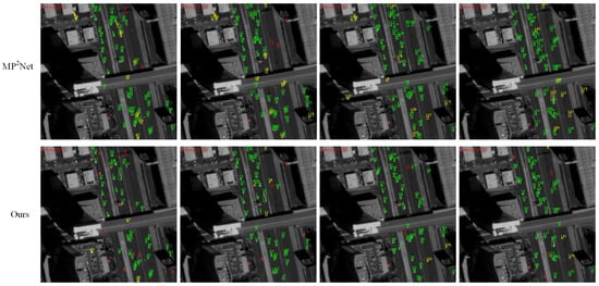 Then, we aslo visualized the results of motion target detection, as shown in Figure 13. MP2Net [19] mistakenly identifies the background motion as a moving vehicle target, generates a false alarm, and also ignores vehicle targets moving at a similar speed to the background motion, resulting in missed detections. The moving target detection algorithm we propose can effectively detect moving vehicle targets in the presence of background movement.