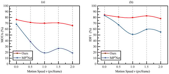 Next, we altered the displacement of the selected region in the dataset to generate several test video sequences with a moving background. The MOTA and IDF1 values with respect to the speed of movement are shown in Figure 12. The video sequence is unified with the public dataset at 300 frames, and there are fewer scenarios where the tracked target is occluded. When the background movement speed is 0 px/frame, the algorithm proposed in this paper is better than MP2Net [19] in regard to both MOTA and IDF1 values. As the background motion speed increases, the MOT algorithm proposed in this paper can effectively track the target in a moving background and maintain its superior tracking metrics.