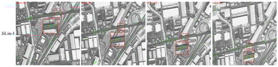 In addition, to verify that the algorithm can function in real-world scenarios with background motion, we tested it using raw images captured via the Jilin-1 satellite, which has a spatial resolution of 0.92 m and a frame rate of 10 fps. The raw output video sequence was cropped to 1024 × 1024 and converted to grayscale images for processing. Since the dataset is not labeled for multi-object tracking, Figure 14 only shows the tracking results of the algorithm proposed in this paper. We fed the video sequence into MP2Net for processing. The background motion in real satellite video sequences is non-linear, and the background motion changes from slow to fast. MP2Net uses a convolutional gate recurrent unit (ConvGRU) in the implicit motion prediction (IMP) stage to enhance moving objects. However, nonlinear movements cause incorrect enhancements in the moving background, making it difficult to detect moving objects. Therefore, MP2Net did not output any tracked targets. The background motion patterns in remote sensing satellite video frames can vary depending on the specific mission being executed. The lack of perception of background movement in IMP makes it impossible to effectively extract moving objects from moving backgrounds.