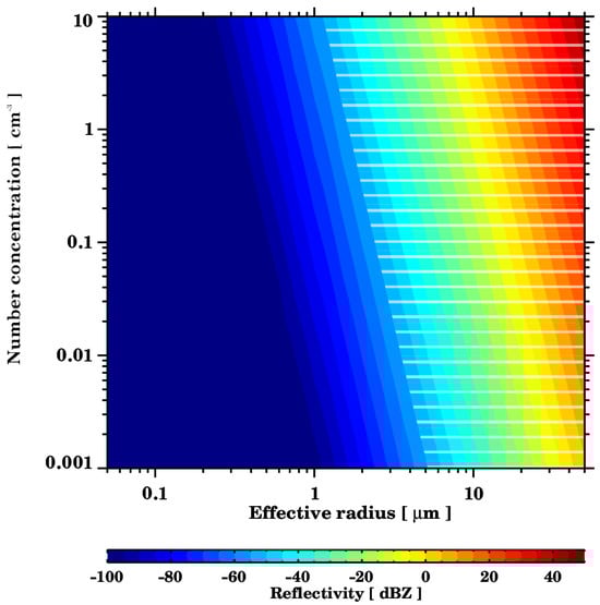Figure 1 reports the estimated theoretical reflectivity at mm for spherical particles depending on their size and number concentration, assuming a gamma particle distribution. The reflectivity is increasing together with the particle effective radius, which is the surface-area-weighted mean radius, and the number concentration; with the highest increase associated with the particle size. The signal is the result of the complex size distribution, which can be represented using different aerosol modes. As previously mentioned, according to the manufacturer, the radar sensitivity threshold is dB at 1 km at a time resolution of 10 s and averaging 200 spectra; reflectivity values above this value are highlighted using white horizontal lines. These values are in line with giant aerosol observations in the atmosphere, such as Exton et al. [41], who found total particle concentrations of a few-per-centimeter cubed in the range 1–23.5 m, and of about 0.1–0.5 cm−3 in the range 5–150 m, and with the measurements performed during the First Aerosol Characterization Experiment (ACE-1), which measured particles with dry radii on the order of 6 to 12 m in concentrations between and cm−3 [5].