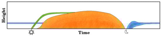The first of the insect characteristics that have to be taken into account is their vertical evolution throughout the day. The depth of the insect layer follows the diurnal variation of the atmospheric boundary layer (ABL) with a minimum during the night-time, sharply increasing in the morning, and reaching a maximum in the afternoon. According to this daily evolution, represented in Figure 2, crepuscular, diurnal, and nocturnal insects can be identified with almost no overlap between them. Crepuscular species take off during the morning twilight period, with small numbers and a generally short-lived flight, although they occasionally continue for some time, and day-time layers are reported [44]. Day-flying migrants take off from mid-morning onward, as atmospheric convection develops, and generally descend in the late afternoon; occasionally, small numbers of day-flying species continue their migration into the night [44]. Nocturnal species typically have a mass take off at dusk and fly throughout the night following the stratification of the nocturnal BL [47,48,49,50,51]. Therefore, they tend to concentrate into layers of shallow depth but broad horizontal extent [52,53,54,55].