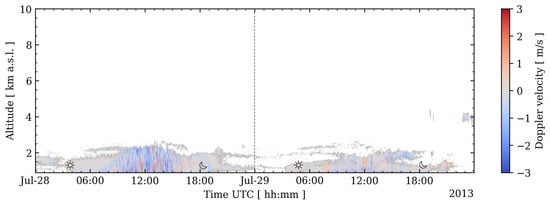 Daily time–range evolution of the Doppler vertical velocity measured by the MIRA36 cloud radar for 28 and 29 July 2013. The sun and moon icons represent the sunrise and sunset, respectively, whilst the dashed vertical line indicates the change in day.