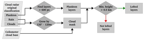 Figure 4 illustrates the approach developed with this purpose. First, according to the cloud radar original classification [56], the plankton (non-hydrometeor) layers are looked for. Due to the speckled nature of the cloud radar images, it was established that the lofted layers should have 600 pixels at least (10 samples in height × 60 samples in time), which corresponds to a 300 m thick layer that lasts for 10 min. Second, the misclassification of the outer cloud and rain pixels into the plankton category that is frequently performed by the original cloud radar classification algorithm needs to be overcome. With this purpose, the cloud and rain areas are expanded 2 min in time and 120 m in range to create a cloud mask. This mask includes the clouds and rain regions, including their outer originally misclassified pixels. Third, the cloud base height detected by the ceilometer is also included into the mask in order to avoid inserting misclassified clouds into the process. Finally, after applying the cloud mask, the remaining layers are classified into lofted or not lofted, depending on their minimum height. In Figure 5, an example of the plankton layers identification is presented.
