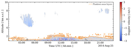 Daily time–range evolution of the Doppler vertical velocity for 25 August 2014. The orange lines show the plankton layers identified by our methodology, whilst the sun and the moon indicate the sunrise and sunset times, respectively.