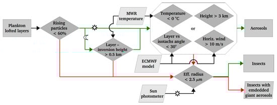 Methodology adopted for the identification of non-hydrometeor targets lofted layers. The green arrow indicates that the condition is fulfilled, and the red one that it is not.