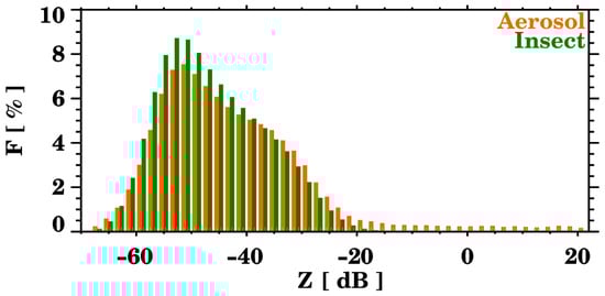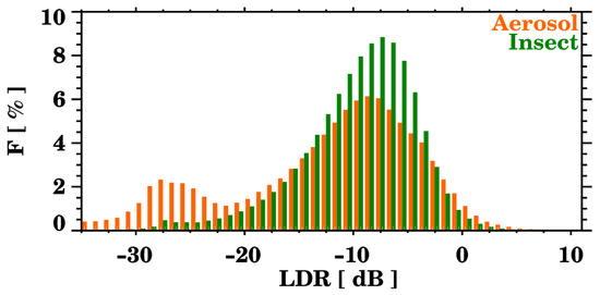 The frequency distributions of the reflectivity (Z) and LDR for aerosols and insects are shown in Figure 7 and Figure 8. The reflectivity distribution (Figure 7) is very similar for both targets. Nonetheless, some small differences are observed: low reflectivity values are observed more frequently for insects, while aerosols reach higher values. The LDR distribution (Figure 8) is bi-modal for the aerosols and unimodal for the insects, with the low values being more common for the aerosols. This indicates that the SNR difference between the co- and the cross-channel is, in general, higher for aerosols. This effect might be due to the effective irregularities of the two targets; for aerosols, non-zero LDR values indicate the presence of non-spherical aerosols and can be highly sensitive to particle shapes and sizes [61].