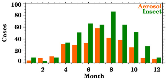 Number of giant aerosol (in orange) and insect layers (in green) per month. As the total number of cases is presented instead of the frequency distribution, the total number of insect layers is much higher than the number of giant aerosol layers.