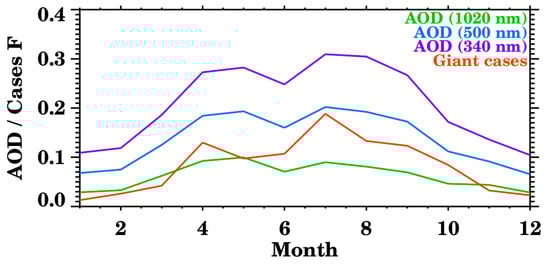 Frequency distribution of giant aerosols cases (“Cases F” on the y-axis, orange line in the plot) as observed by the cloud radar together with AOD measured by AERONET at 340, 500, and 1020 nm.