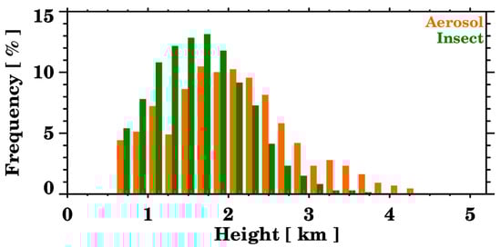 The number of giant aerosol layers during the day and the night is very similar, while the number of insect layers during the night is much higher than during the day. As our algorithm is identifying lofted layers, the insects that are found within the convective ABL during the day-time are not accounted for, whilst nocturnal species flying in layers of shallow depth but broad horizontal extent are. This is in line with the entomology study’s description of the insects’ behavior that we previously described in Figure 2: they mainly fly within the convective ABL during the day and follow the stratification of the nocturnal stable boundary layer during the night. Nevertheless, this could also be caused by one of the steps in the screening procedure, in which the temperature inversion height is compared to the height of the aerosol/insect layer. The information from the sun photometer, used to detect embedded giant aerosol layers, was available for the 48.3% of the total insect cases, and it was found that the 12.9% of the insect layers to which this criterion could be applied contained giant aerosols. Henceforth, only the aerosol and insect layers without embedded giant aerosols will be considered in order to compare the two targets.