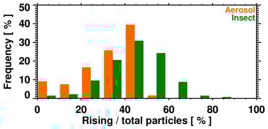 Concerning the layers’ vertical distribution (Figure 11), aerosols are usually located at higher altitudes compared to insects. This is caused by the preference of insects to stay within the ABL. Figure 12 shows the distribution of the percentage of rising particles of the layers: most of the time, the aerosol layers have a vertical velocity close to zero (of the total number of particles in each layer, between 40 and 60% have ascending velocities), and in some cases most of the particles are falling (lower percentage of rising particles within each layer). This characteristic helps to distinguish these layers from the insect ones, as insects tend to follow the upward motion of the air parcels.