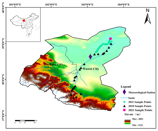 The Shiyang River Basin is one of the three major inland river basins in China. It is located in Gansu Province, Northwest China, east of the Hexi Corridor. The basin is bounded to the west by the Wushaoling Mountains and to the north by the foothills of the Qilian Mountains [44]. The basin is geographically situated within 101°22′–104°16′E and 36°29′~39°27′N (Figure 1), with a total area of approximately 4.16 × 104 km2. The basin has a topography that slopes from the southwest to the northeast in China, with the southern part being higher than the northern part, which comprises the Qilian Mountains, the corridor plains, the low hills, and the desert areas from south to north [44,45]. The average annual precipitation in the basin is 197.957 mm, and the average annual temperature is 7.745 °C. The annual evaporation ranges from 700 mm to 2600 mm [44,46,47]. Situated on the boundary of the monsoon region, the Shiyang River Basin is influenced by both the Asian winter and summer monsoons, as well as the westerly circulation [48]. The unique interplay between water and heat conditions at varying altitudes gives rise to pronounced vertical climatic gradients, leading to the formation of distinct vertical zones characterized by diverse and unique landscapes [49].