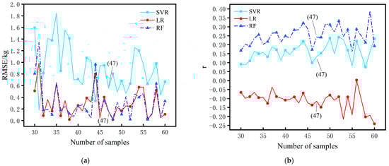 Plots comparing the RMSE and r for 30–60 samples for three methods ((a): RMSE; (b): r).