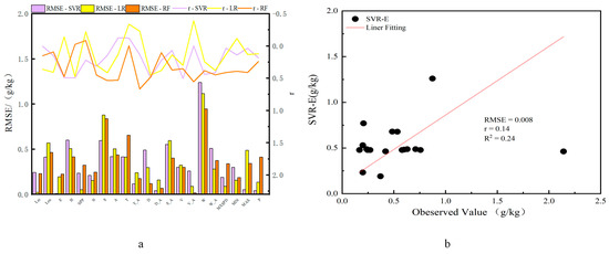 where n represents the number of samples, ai represents the measured SOC content, and bi represents the calculated SOC content. The RMSE reflects the difference between the observed and estimated measured values. The smaller the RMSE value is, the smaller the overall difference between the observed and estimated values. On the other hand, r represents the tendency between the observed and true values. The larger the value of r is, the closer the pattern of fluctuation in the observed values to the true values. R2 quantifies how well the independent variables explain the variation in the dependent variable in a regression model.