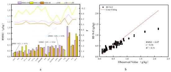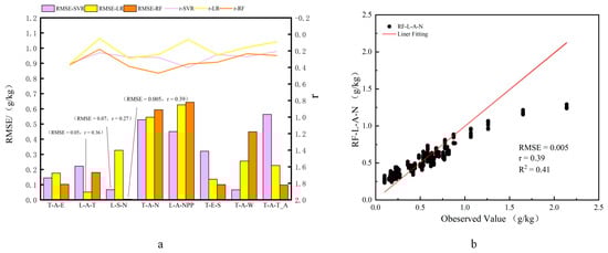 On the basis of the single-factor comparison and screening, the five most effective schemes of factors were selected; these factors were the average dewpoint, NDVI, temperature, elevation, and latitude. The other environmental factors were then added to these five factors separately. A total of 100 estimation schemes were used to compare the performance of the two environmental factors. Among them, 17 schemes had RMSE values less than 0.04, and the absolute values of r were greater than 0.2. In addition, the smallest RMSE values and largest r values of the three methods were also selected. These results are shown in Figure 4. The optimal scheme for the RF model was the NDVI and elevation (RMSE = 0.07, r = 0.38, R2 = 0.31), that for the SVR model was latitude and temperature (RMSE = 0.11, r = 0.31, R2 = 0.2), and that for the LR model was elevation and maximum precipitation (RMSE = 0.05, r = 0.30, R2 = 0.16). For RF and SVR, the estimation accuracy effectively improved after increasing the number of environmental factors to two. However, the performance did not show an obvious improvement and even declined in some schemes for LR. When the performances of the RMSE and r of the three methods are jointly compared, the RF performed the best when the NDVI and elevation were used as driving environmental variables.