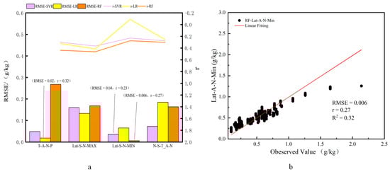 Considering the RMSE, r, and R2 values together, the SVR was the best when the elevation was the environmental factor (RMSE = 0.008, r = 0.47, R2 = 0.24). For LR, the best results were obtained when latitude was used as the environmental factor (RMSE = 0.02, r = 0.36, R2 = 0.139). For RF, the average dew point yields were the best environmental factor (RMSE = 0.07, r = 0.67, R2 = 0.18). Although SVR had a slightly lower RMSE and R2 value than RF did, the r value of RF was much greater than that of SVR. Therefore, the overall performance of RF was superior to that of SVR.