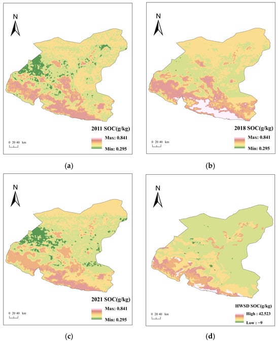 The HWSD is the most widely used traditional soil database in the world and contains geographical information on the physical and chemical properties of soil from regional and national inventories worldwide [65,66]. The HWSD map of SOC across the Shiyang River Basin revealed that the SOC values ranged from −9 to 42.523 g/kg, with an average of 0.98 g/kg and a standard deviation of 2.44 g/kg (Figure 7d). According to the results for calculating the optimal estimation scheme in this study, the SOC values for the Shiyang River Basin in 2011, 2018, and 2021 ranged from 0.295 to 0.841 g/kg, with mean values of 0.49 g/kg, 0.54 g/kg, and 0.50 g/kg and standard deviations of 0.07 g/kg, 0.1 g/kg, and 0.08 g/kg, respectively. By comparing the distributions of SOC in the HWSD and this study, the range of fluctuation in the HWSD was larger than that for the RF method, but the accuracy of the HWSD (RMSE = 0.41, r = 0.19, R2 = 0.11) was much worse than that of the result in this study (RMSE = 0.005, r = 0.39, R2 = 0.41). The accuracy increased by 98% and 51.5%, respectively. The accuracy of the HWSD was poor because of the uneven spatial distribution of profiles in certain areas [15,16,62,67]. Thus, a more precise distribution of SOC was mapped in this study.