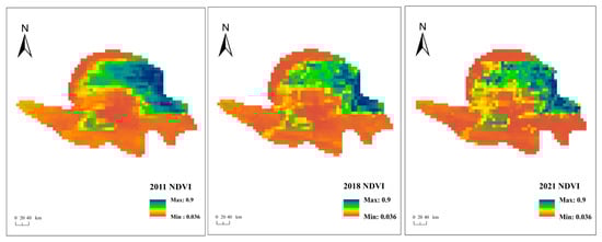 Comparison of the NDVI values in the northwestern part of the middle basin in 2011, 2018, and 2021.