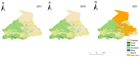 Comparison of the land use type of the northwestern part of the middle basin in 2011, 2018, and 2021.