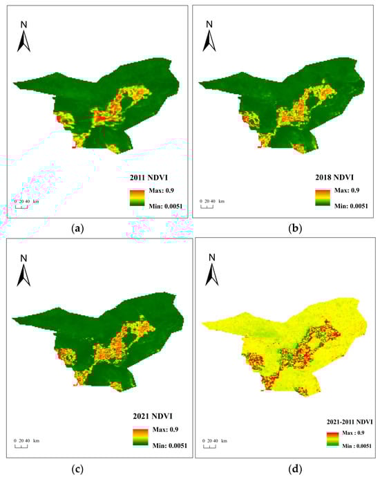 Comparison of the NDVI in the lower reaches of the Shiyang River in 2011, 2018, and 2021 ((a): 2011; (b): 2018; (c): 2021; (d): map showing the comparison between 2011 and 2021).