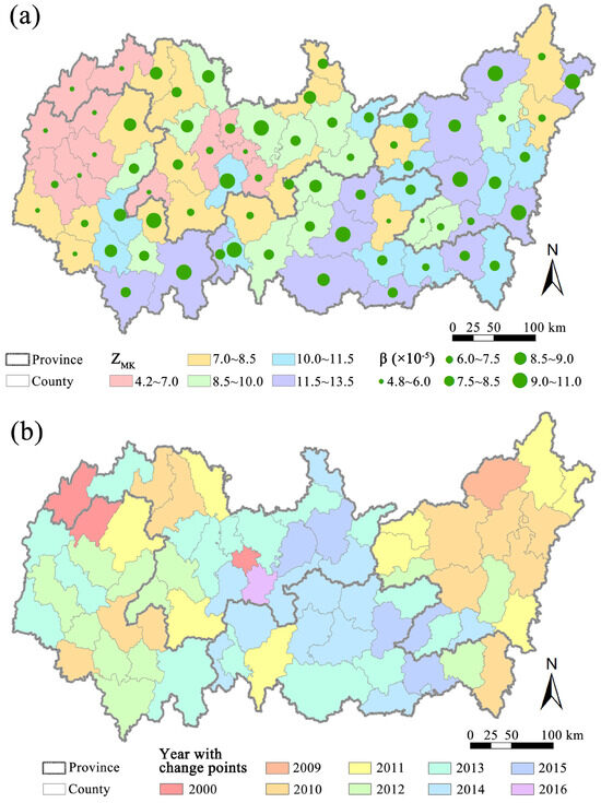 Figure 4. Statistics ZMK and β and turning points in grassland from M-K trend test for mean NDPI values of grasslands. (a) spatial distribution of ZMK and β; (b) spatial distribution of year with turning points.