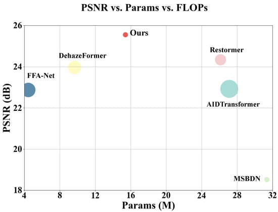 - Evaluations on real-world datasets. To further validate the generalization performance of various approaches in real-world remote sensing scenarios, we conduct a thorough evaluation of our proposed method using the real-world RRSD300 dataset [], which is specifically designed for RS image dehazing tasks. It includes image data from multiple scenes, covering a variety of geographic regions and environmental conditions. In this context, Figure 7 presents a detailed comparative analysis of the visual results generated by several different algorithms, allowing for an insightful assessment of their effectiveness. It becomes increasingly evident that earlier methods [,,] often lead to noticeable color distortions when applied to real-world scenes, thereby compromising the overall visual fidelity and authenticity of the restored images.