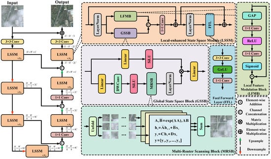 Pushing the boundaries of this field, the Mamba framework [] emerges as a pioneering data-dependent SSM that has demonstrably outperformed traditional Transformers in various natural language processing tasks. This advancement underscores the evolving capabilities of SSMs in addressing complex linguistic challenges. Moreover, recent investigations have successfully applied SSMs across a spectrum of low-level vision tasks, yielding remarkable results in applications such as image dehazing [,,], image super-resolution [,,], and low-light image enhancement [,,,]. Despite these notable achievements, it is imperative to recognize that existing SSMs have not sufficiently prioritized the capture of local information—a critical component for ensuring high-quality reconstruction in remote sensing (RS) applications. Addressing this limitation could significantly enhance the fidelity and robustness of reconstruction processes, ultimately advancing the field of visual state space modeling.