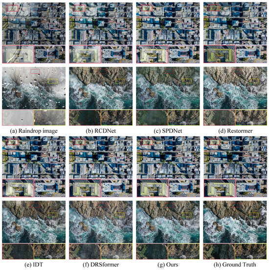 - Evaluations on datasets for image deraining. We further assess our proposed method, Weamba using the recent UAV-Rain1k dataset []. Following the framework established by [], we compare Weamba against several notable algorithms, including DSC [], RCDNet [], SPDNet [], Restormer [], IDT [], and DRSformer []. The quantitative results for the various methods evaluated are comprehensively presented in Table 3. It is particularly noteworthy that our approach achieves the highest PSNR value among the compared algorithms, which serves to underscore its superior effectiveness in tackling the image deraining task. In addition to these numerical results, Figure 6 provides a detailed visual comparison of the restoration outcomes generated by each algorithm. It becomes increasingly clear that raindrops create varying levels of obstruction in remote sensing images, complicating the restoration process. Unlike other models that tend to leave behind differing degrees of rain artifacts, our method excels in not only effectively eliminating unexpected raindrops but also in successfully restoring the intricate texture details of the background, thereby bringing them into closer alignment with the ground truth. This dual capability enhances the overall quality of the restored images, demonstrating the robustness of our approach.