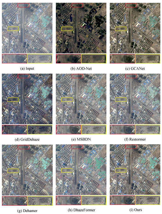 Although Transformer-based methods show promise in capturing global contextual information, they are not without their drawbacks; specifically, they can inadvertently compromise fine details in certain regions of the image, leading to a loss of texture fidelity. Our proposed method, however, strikes an effective balance between removing the spatially varying haze effects and preserving the intricate texture details inherent to the original remote sensing backgrounds. This capability not only underscores the robustness of our approach in addressing the complexities of non-uniform haze but also emphasizes its potential to enhance image clarity and detail retention. Consequently, the results produced by our method stand as a testament to its superior performance, delivering restored images that are markedly clearer and more detailed than those generated by existing techniques, thus advancing the state of the art in remote sensing dehazing applications.