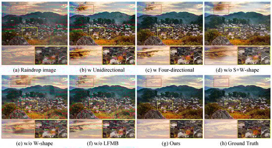 - Effectiveness of the LFMB. We present the LFMB with the objective of empowering the model to adeptly capture complex global and local dependencies inherent in the data. To assess the impact of the LFMB, we conduct a performance comparison by omitting this critical component. In comparison to model (f) in Table 4, our proposed method (g) yields a notable Peak Signal-to-Noise Ratio (PSNR) enhancement of 0.12 dB on the UAV-Rain1k dataset. Furthermore, as illustrated in Figure 9, our approach demonstrates a superior ability to preserve fine textures in remote sensing (RS) images upon the integration of the LFMB. This improvement underscores the significance of the LFMB in enriching the model’s capability to maintain intricate details, thereby enhancing the overall fidelity and quality of the reconstructed images.