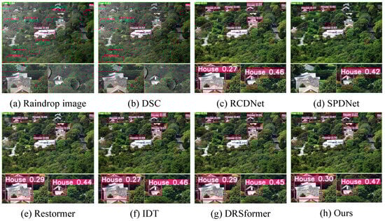 With the progression of RS imaging technology, these methods are increasingly employed for evaluating forested regions, aiding conservation, management, and ecological research. To assess the impact of our image restoration process on subsequent vision-based RS applications, particularly object detection, we utilize established pre-trained object detection models like YOLOv5 to appraise our outcomes []. As depicted in Figure 10, our technique not only yields clearer images but also markedly improves the precision of target recognition, especially in pinpointing structures such as houses. For example, in contrast to SPDNet, which struggles to detect a house in the bottom left corner of the image, our method identifies it consistently and accurately. Following [], we calculate the mean Average Precision (mAP) for joint image deraining and object detection. Here, we set the IoU threshold to 0.5. From Table 8, our reconstruction results achieve the best quantitative performance. This demonstrates the strength of our approach and its potential to enhance the practicality and efficacy of real-world remote sensing applications. The capacity for dependable object detection in restored images is vital for a range of ecological and managerial tasks, thus reinforcing the significance of our method in the advancement of the remote sensing domain.