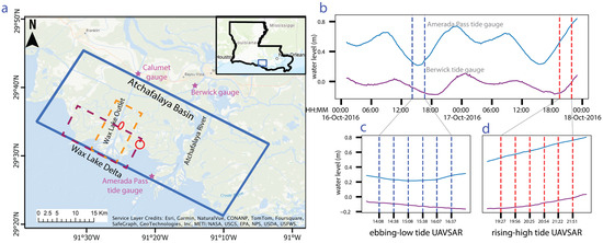 (a) Study area showing the UAVSAR image footprint (blue rectangle) and other areas discussed in the text. (b) Water level at the Amerada Pass and Berwick tide gauges during the two days of the UAVSAR acquisitions. (c,d) Plots showing the tidal variation during the ebbing-to-low tide (c) and rising-to-high tide (d) UAVSAR flights. The times of the UAVSAR acquisitions are indicated with vertical lines.