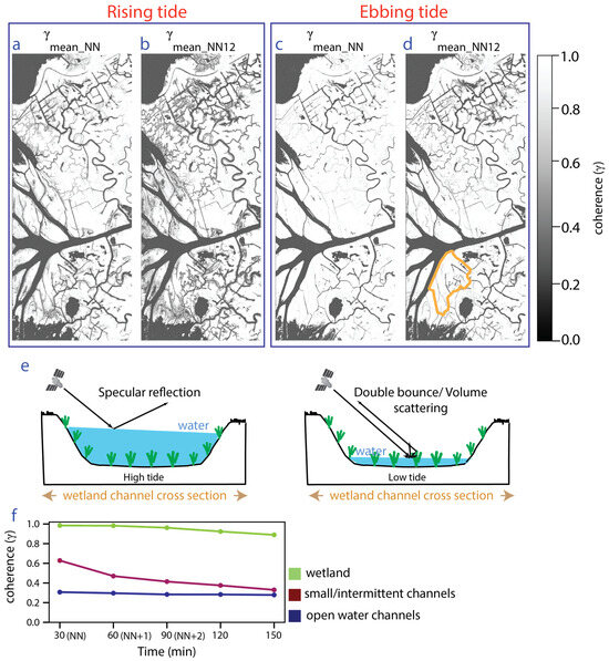 Mean coherence image of NN and NN1 and 2 interferograms for the Wax Lake Delta area during rising tide (a,b) and ebbing tide (c,d) (Geographic location and extent of the area are shown with a purple dotted rectangle in Figure 1. See Supplement Figure S1 for full frame version). (e) Illustration showing the water level in a channel containing vegetation and SAR backscatter from the channel surface depending on the presence of emergent vegetation, which varies across the tidal cycle. (f) Variation in coherence with time over pixels identified as open water, wetland, and small/intermittent channels (locations were identified using high-resolution NAIP imagery (Supplement Figure S4)). Orange line in (d) shows the island used to identify representative locations for (f).