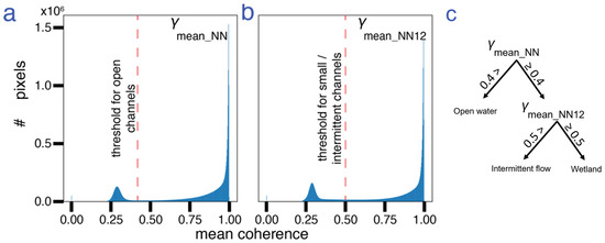 Histograms of mean coherence of (a) NN and (b) NN1 and 2 rising-tide interferograms. (c) Flowchart of the steps to derive the channel maps from coherence showing the thresholds used. Pixels below the threshold are identified as open water channels. Pixels below the threshold are identified as intermittent channels only if they are not identified as open water pixels.
