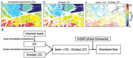 (a) Connected components grown over channel mask. (b) Connected components after morphological erosion operation. (c) Channel bank pixels obtained after subtracting (b) from (a). (d) Flowchart of the steps to derive overbank flow from channel mask and phase timeseries. Geographic location and extent of the area in are shown with an orange dotted rectangle in Figure 1.