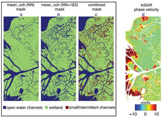 (a) Channel mask using mean coherence of rising-tide NN interferograms; (b) channel mask using mean coherence of rising-tide NN1 and 2 interferograms; (c) combined mask retaining channels from (a) as open water channels and channels only in (b) as intermittent channels. The wetland category (green) contains pixels that maintained high average coherence in both NN and NN1 and 2 interferograms. (d) InSAR phase velocity from rising-tide data showing areas of water-level change. The warmer colors (yellow-red) indicate a rise in water level and the cooler colors (cyan-blue) indicate a fall in water level.