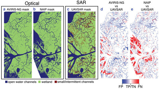 Comparison of optical (a) AVIRIS-NG and (b) NAIP water channel masks with (c) UAVSAR mask. Classification accuracy indicating the location of water class FPs and FNs in the UAVSAR mask compared to (d) AVIRIS-NG and (e) NAIP masks. In d and e, white color indicates pixels’ class matches between both optical and SAR masks (see Supplement Figure S2 for full frame version).