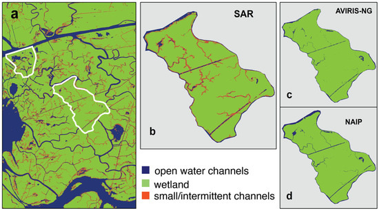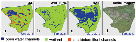 For wetlands at high latitudes, icy conditions can lead to coherence on land even less than 0.4, thus reducing the ability to differentiate between channels and wetlands [95]. In some areas, wetlands are water-logged near-continuously (muddy and less vegetation—Figure 13d), and these areas might be identified as either land or water depending on the time of acquisition. The NAIP mask which is generated using acquisitions from multiple years taken during different seasons (both fall and spring) identified this area as water (Figure 13c), whereas the UAVSAR (Figure 13a) and AVIRIS-NG (Figure 13b) masks identified parts of the same area as water or land, probably because of differences in the time of acquisition, river stage, and vegetation cover. Also, the presence of the SWIR band in AVIRIS-NG could have resulted in a better classification of muddy areas compared to NAIP.