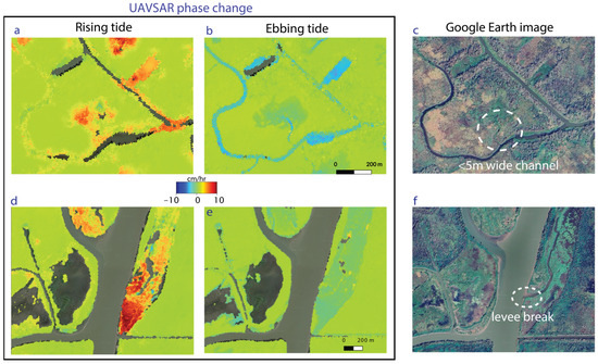UAVSAR phase change observed in the interior of the wetland during (a,d) rising tide and (b,e) ebbing tide. The difference between where the water goes during the different stages of the tides is clear. Overbank flow is more extensive at rising/high tide, but small channels still transport water within the island interior at ebbing/low tide. (c,f) Optical images to show the landscape (source: Google Earth [86,87]). Service Layer Credits: © 2024 Airbus. Geographic location of the areas in a&d are shown with red circle and ellipse in Figure 1.