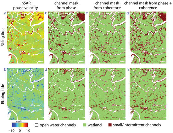 (a,b) UAVSAR phase velocity showing water-level change rate for rising tide and ebbing tide; (c,d) channels derived using a threshold on phase; (e,f) channels derived using a threshold on coherence; and (g,h) channels derived using both phase and coherence.