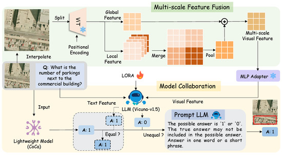 This paper explored the potential capabilities of LVLMs in RS VQA tasks and proposed Co-LLaVA via a model collaboration (MC) strategy. The visual understanding results of the lightweight generative model CoCa were utilized as a reference, allowing LLaVA-v1.5 to correct or reduce its erroneous visual understanding results. This strategy could effectively mitigate the hallucination phenomenon in LVLMs. To adapt Co-LLaVA to the varying object scales in RS images, we introduced a multi-scale feature fusion (MFF) module to fuse global and local information. This module enhanced Co-LLaVA’s perception of details in RS images via increased resolution. We compared Co-LLaVA with existing methods across four test sets and conducted extensive experiments to evaluate the effectiveness of Co-LLaVA and its components. The experimental results demonstrated that Co-LLaVA significantly outperforms the current state-of-the-art methods across multiple metrics.