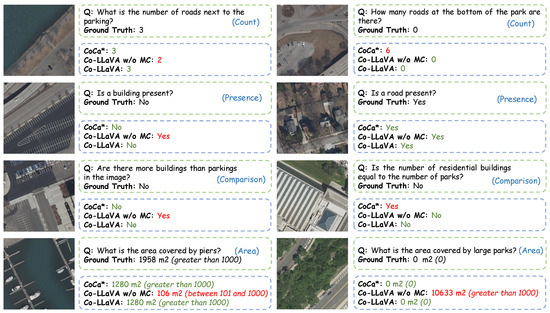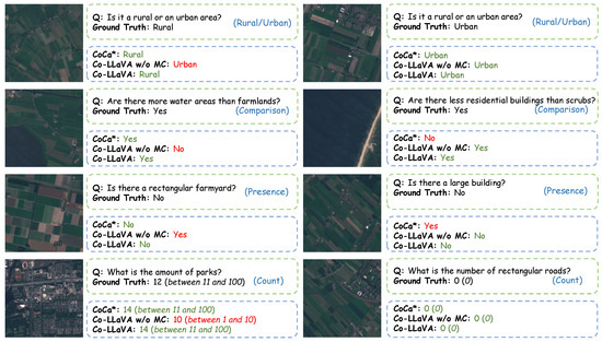 Typical image–question–response trios from test set of RSVQA-LR. When Co-LLaVA w/o MC (without the help of CoCa*) generates an answer different from CoCa*’s, Co-LLaVA can revise its response with the help of CoCa* in most cases. Blue indicates the question type, while green indicates a correct answer and red indicates a wrong answer.