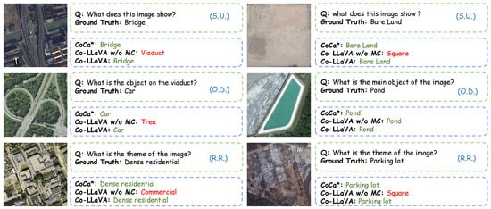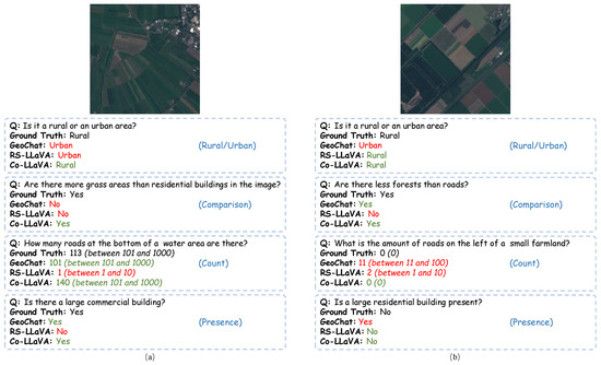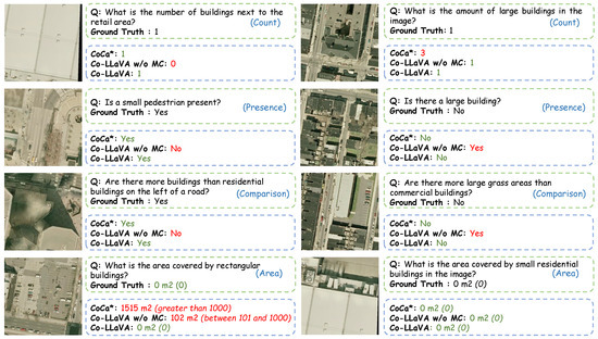 In this section, we conducted a qualitative analysis of the effectiveness of Co-LLaVA. Figure 3, Figure 4, Figure 5 and Figure 6 demonstrate visual examples of typical image–question–response trios selected from Test Set 1 of RSVQA-HR, Test Set 2 of RSVQA-HR, test set of RSVQA-LR, and test set of the subset of CRSVQA, separately. Compared to Co-LLaVA w/o MC, Co-LLaVA is able to predict the correct answers in most cases with the help of CoCa*, even when faced with challenging counting problems. Figure 6 features diverse scenes, demonstrating that Co-LLaVA can provide accurate responses based on questions across multiple scenes. Certainly, there are some edge cases. In the “Count” question type of Figure 3, when CoCa* generates the incorrect answer “6” and Co-LLaVA w/o MC generates the correct answer “0”, Co-LLaVA is able to maintain the original correct answer by considering both responses. Similarly, in the “Comparison” and “Presence” question types of Figure 5, when either CoCa* or Co-LLaVA w/o MC generates the correct answer, Co-LLaVA is able to produce the correct answer in most cases. More interestingly, as shown in the “Area” question type of Figure 4, when CoCa* and Co-LLaVA w/o MC provide different answers, Co-LLaVA gives a third answer after evaluating the two, and the third answer matches the ground truth, demonstrating that grants Co-LLaVA the ability to rethink. We also compared responses from our method Co-LLaVA with other methods (i.e., GeoChat and RS-LLaVA) on the test set of RSVQA-LR in Figure 7. Figure 7 demonstrates that Co-LLaVA could respond correctly when faced with challenging image–question pairs in most cases. For instance, in Figure 7a, both GeoChat and RS-LLaVA provide incorrect answers for the “Rural/Urban” and “Comparison” question types, while Co-LLaVA successfully delivers the correct responses. Similarly, in Figure 7b, for the “Count” question type, GeoChat and RS-LLaVA also yield incorrect answers, whereas Co-LLaVA is able to provide the correct answer. Regarding the “Presence” question types illustrated in Figure 7, either GeoChat or RS-LLaVA tends to give incorrect answers, while Co-LLaVA consistently offers correct responses.