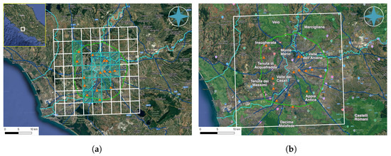- Air temperature: This data is provided by in situ measurements from 15 weather stations, indicated by the orange triangles in Figure 1. These stations are part of the ASTI-Network, established within the framework of the LIFE-ASTI project. The network includes stations from the Meteo Lazio amateur network [26], as well as additional stations installed specifically during the project to cover areas lacking data.